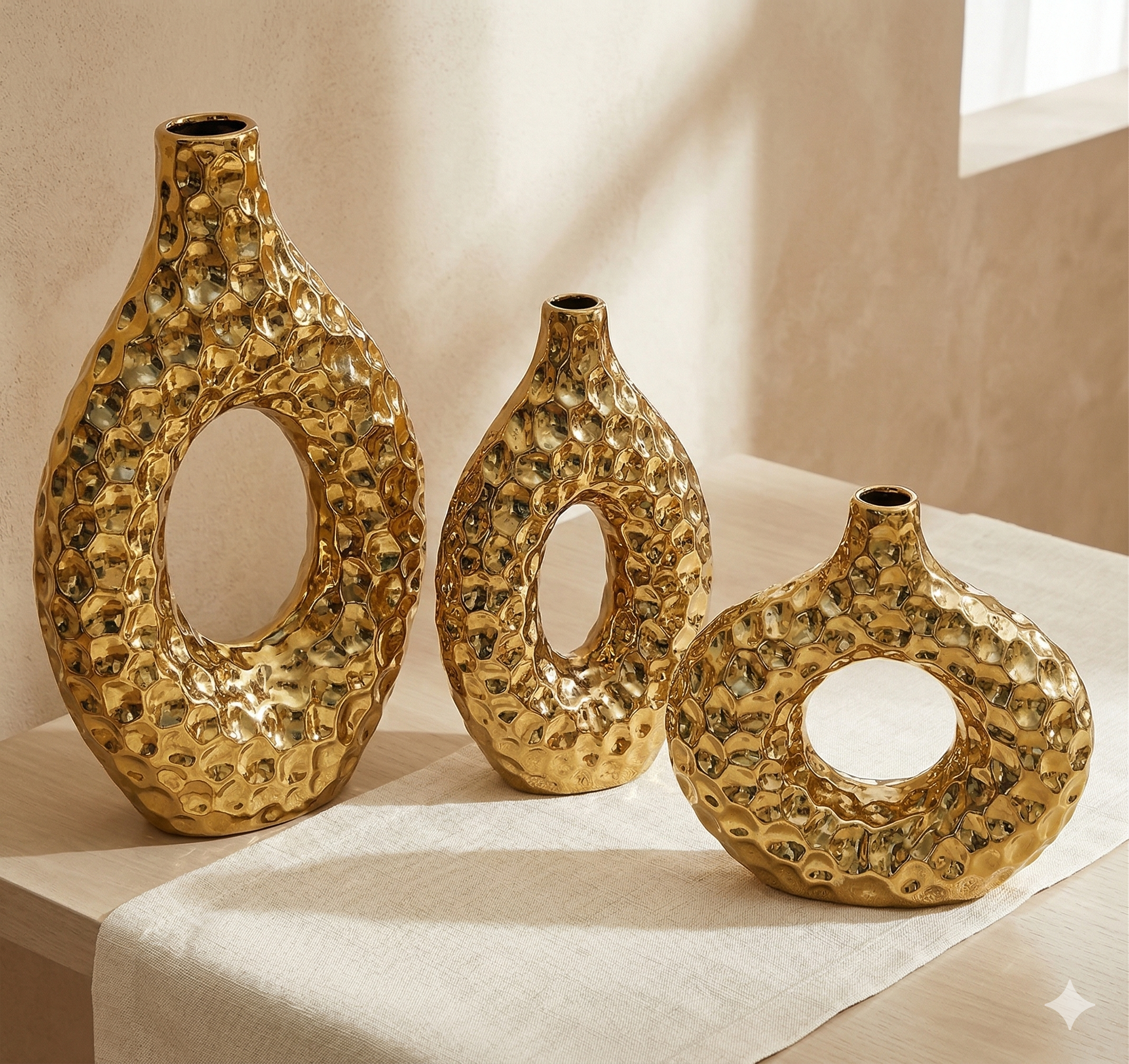 The organic hammered detailing adds a luxurious statement feel, making these vases perfect for console tables, dining setups, shelving units, or as standalone art pieces. Whether styled together or separately, they instantly elevate any modern, contemporary, or glam interior.