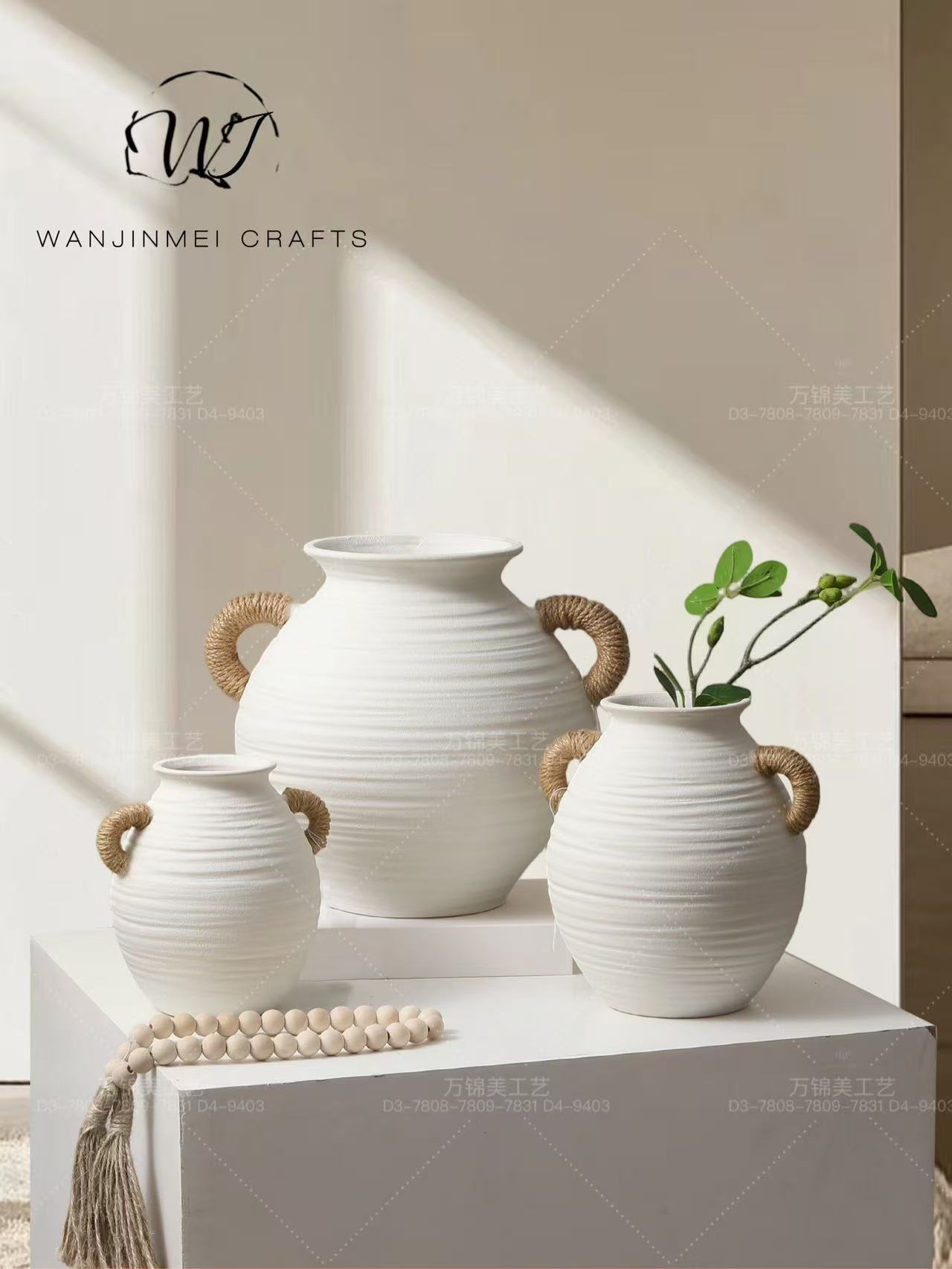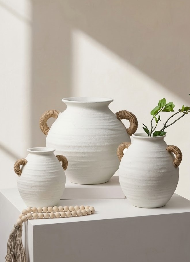 The distinctive side handles wrapped in natural rope detailing introduce a warm organic contrast, blending contemporary design with artisanal character. Their balanced proportions make them perfect for styling as a coordinated set or as individual accent pieces.